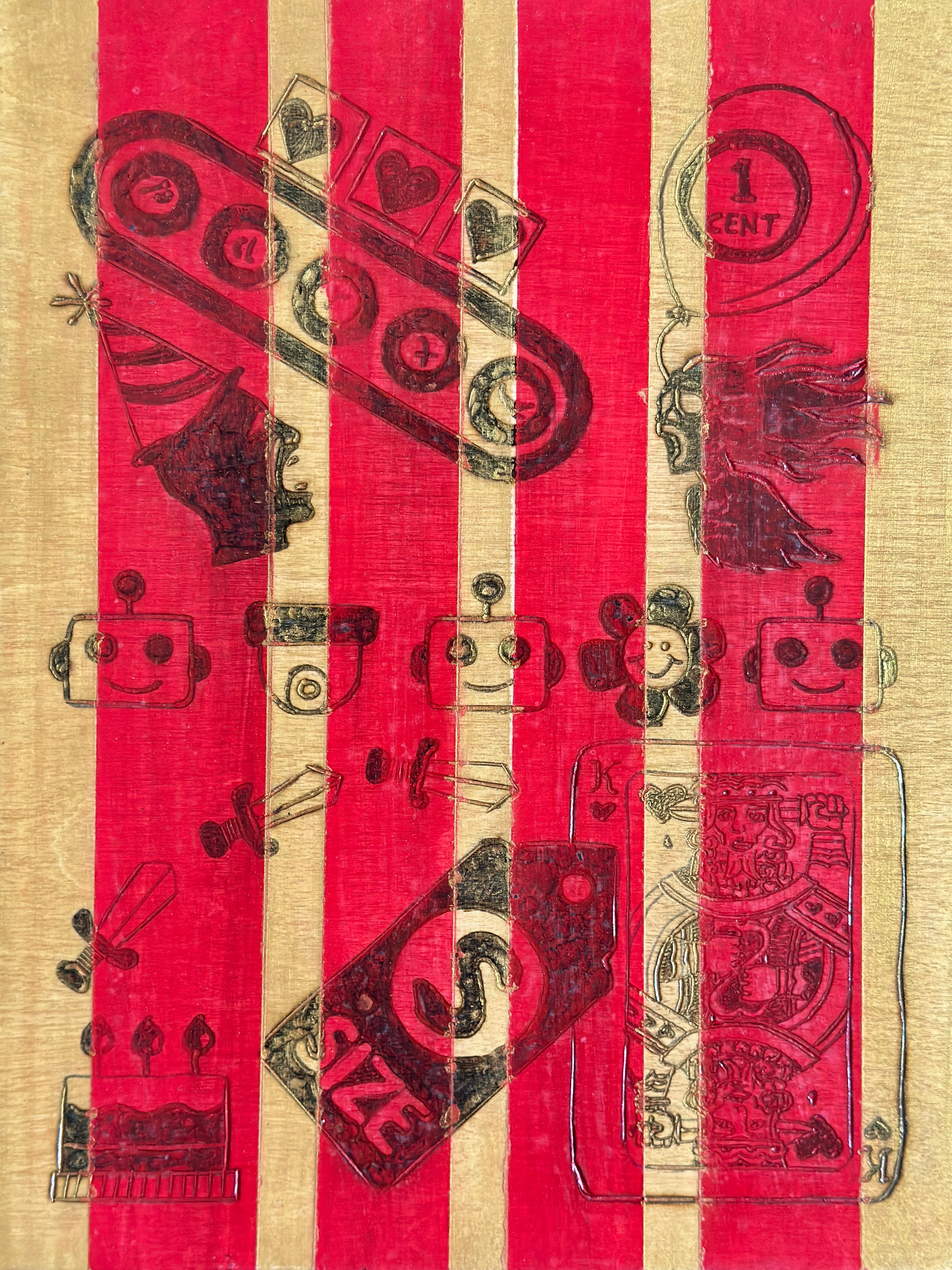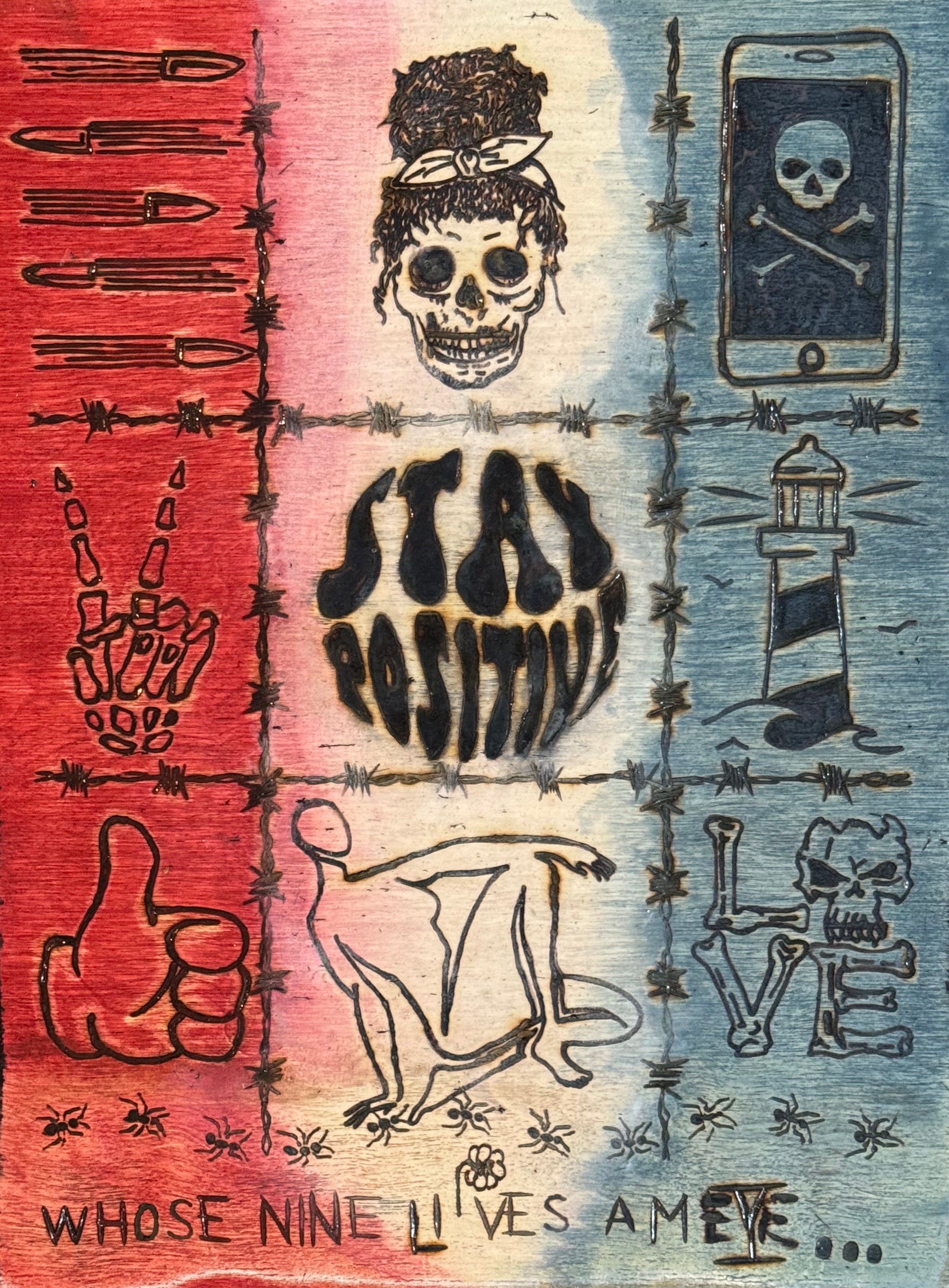 Working in pyrography, I began feeling the fire between my fingertips, a fire which felt like channeling an ancient force, to burn images into wood. Meditating on contemporary iconography, I located images which, when combined, suggest a narrative tension around stories of vulnerability, of claiming agency, of navigating a landscape where predators roam freely.